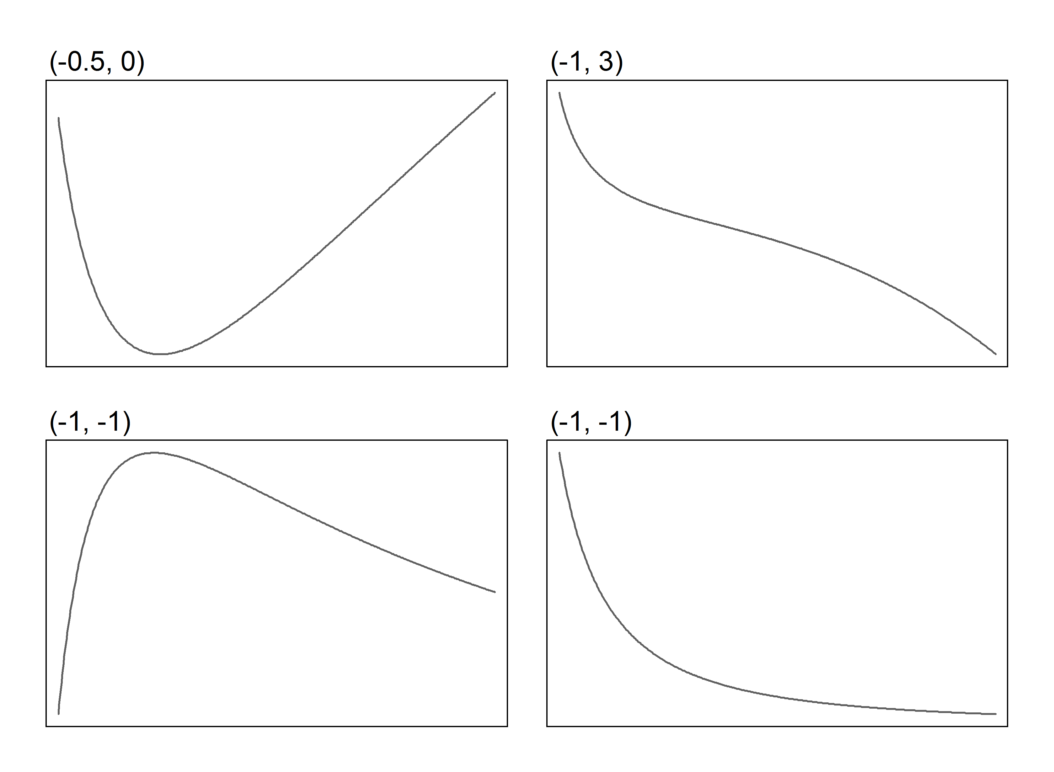 All four of these functions are second-degree FPs. They have just two regression coefficients and two powers. For example, the top left curve has the following form: β1x-0.5 + β2 log x. The two bottom curves have the form β1x-1 + β2x-1 log x. The bottom two are examples of ‘repeated powers’ FP models.