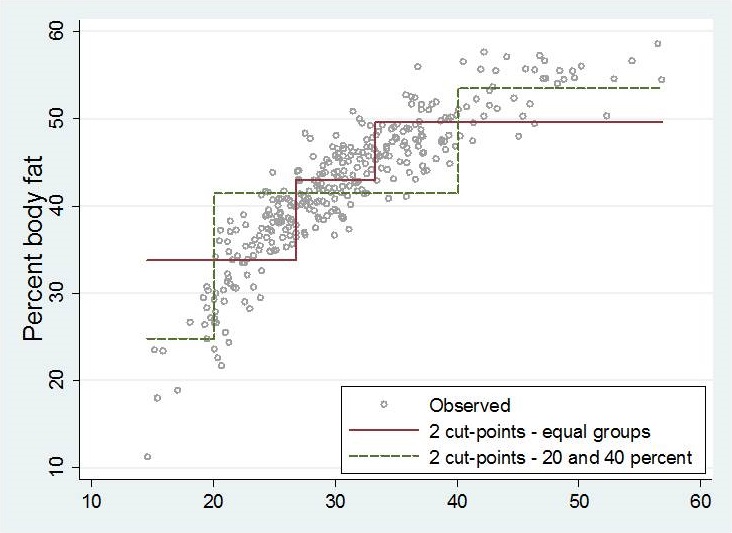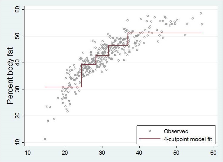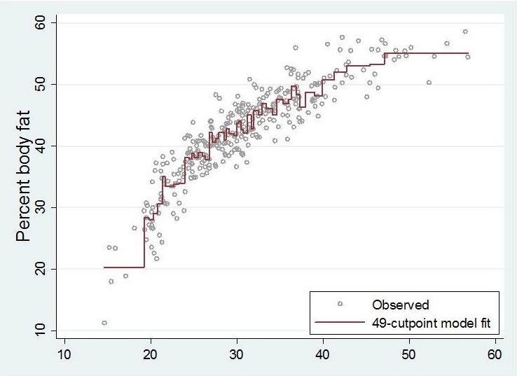 None of these step functions seem to describe the influence of bmi on percentage body fat well enough