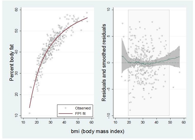 As shown by the residuals and the related smoother with 95% confidence interval, the FP1 function fits the data well. The pale shaded area shows the inner 95% region of the data.
